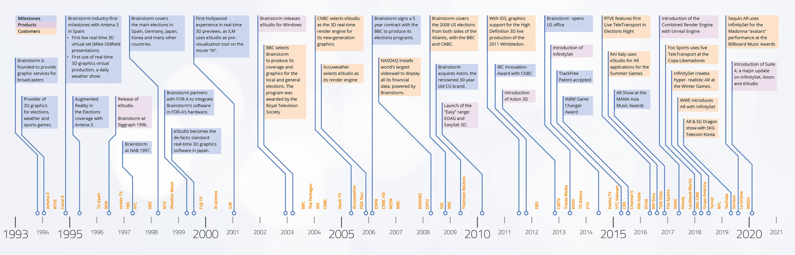 Fundada en 1993, Brainstorm es una empresa especializada que se dedica a proporcionar soluciones de software líderes en la industria, para gráficos 3D en tiempo real y escenarios virtuales para broadcast, producción cinematográfica y presentaciones corporativas. Nos centramos en ayudar a nuestros clientes a crear experiencias visuales muy atractivas para sus espectadores, reduciendo al mismo tiempo los costes de producción, creando soluciones avanzadas que son rápidas, fiables y flexibles.